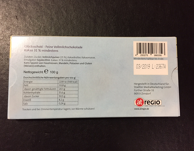 Zutaten: Zucker, Vollmilchpulver 25%, Kakaobutter, Kakaomasse